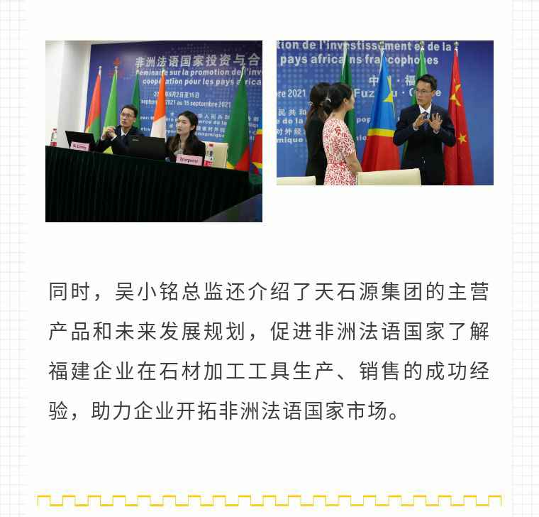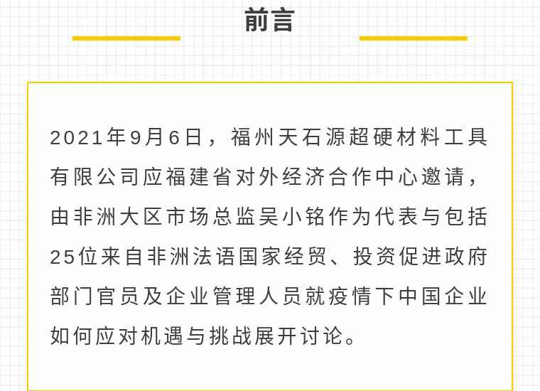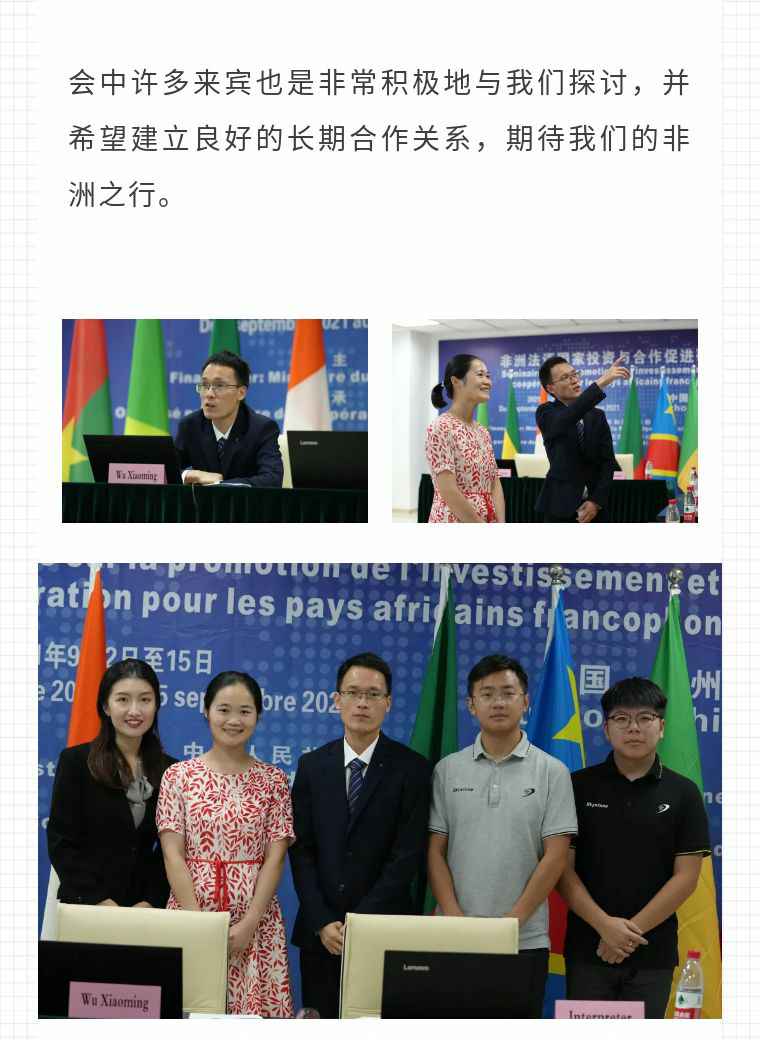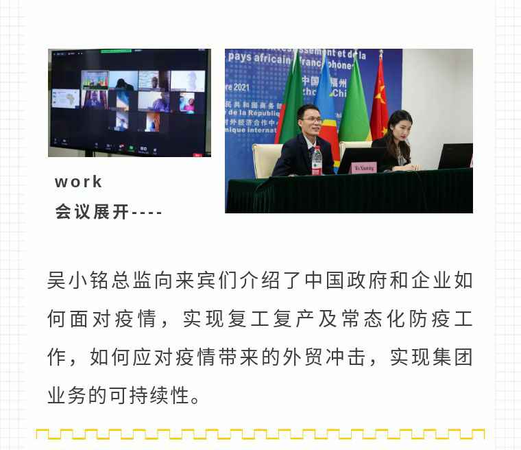 2021年9月6日,世界杯官方端网站登录入口-世界杯(中国)应福建省对外经济合作中心邀请,由非洲大区市场总监吴小铭作为代表与包括25位来自非洲法语国家经贸、投资促进政府部门官员及企业管理人员就疫情下中国企业如何应对机遇与挑战展开讨论。